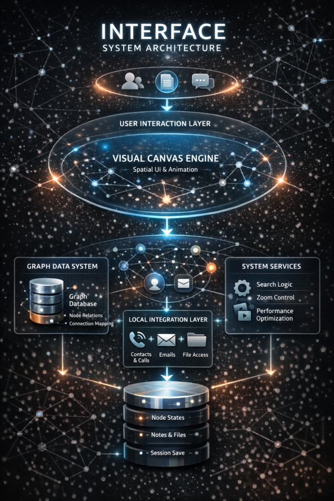 Instead of navigating through rigid hierarchies, Interface lets you move through your real world as a living structure. Every contact or element becomes a visible node—connected, responsive, and within reach.